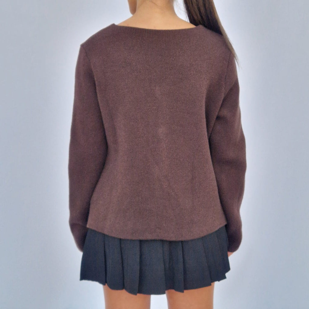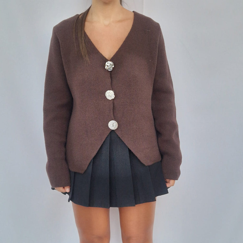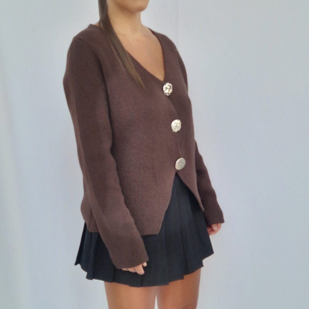 Ilumine o seu look com este casaco de malha castanho , uma peça cheia de charme e personalidade. Com uma malha macia e estruturada, ele traz um toque sofisticado com os botões dourados— um detalhe que transforma o básico em algo especial